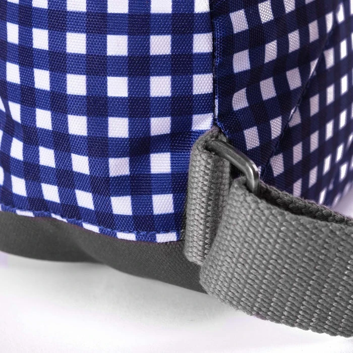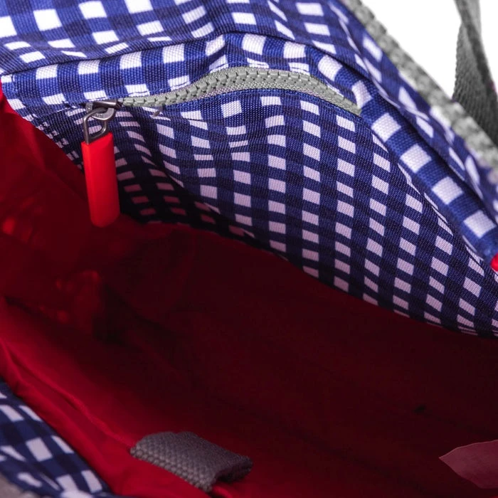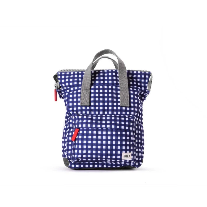 Mochila de la marca Roka London, modelo Bantry B. Tamaño pequeño con medidas 32 cm x 23 x 10 cm. y capacidad de 7,35 ltr. Confeccionado con materiales reciclados (PET), y aptas para veganos. Su material es repelente al agua. Lleva un bolsillo exterior central cerrado con cremallera. En el interior lleva compartimento acolchado para tablet y dos bolsillos con cremallera.Cierra con cremallera en la parte superior. las tiras de la espalda son de algodon para mas comodidad. Color cuadros azules.